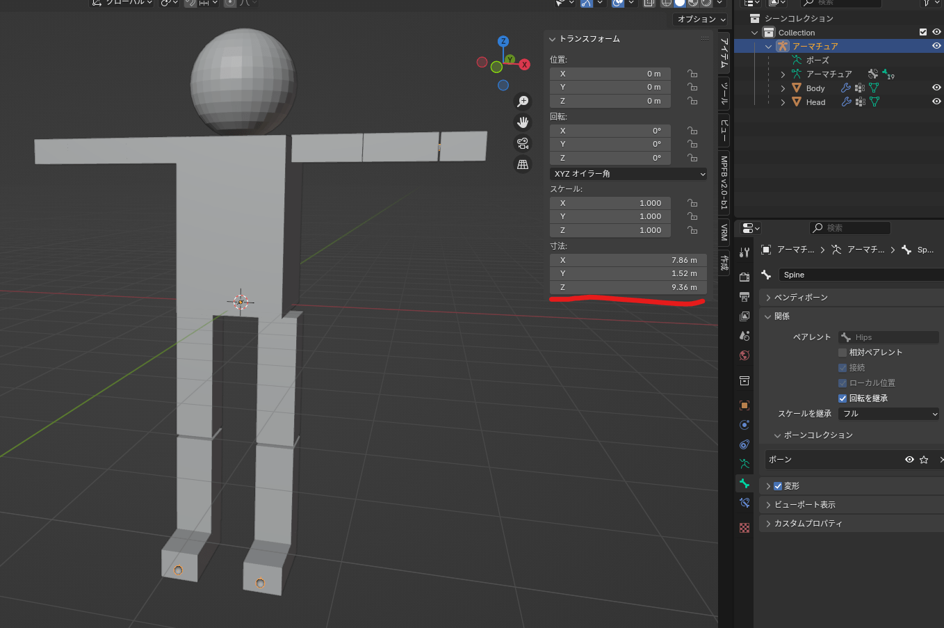 現状だと身長が9.36mもあるため、一般的なサイズに調整します。