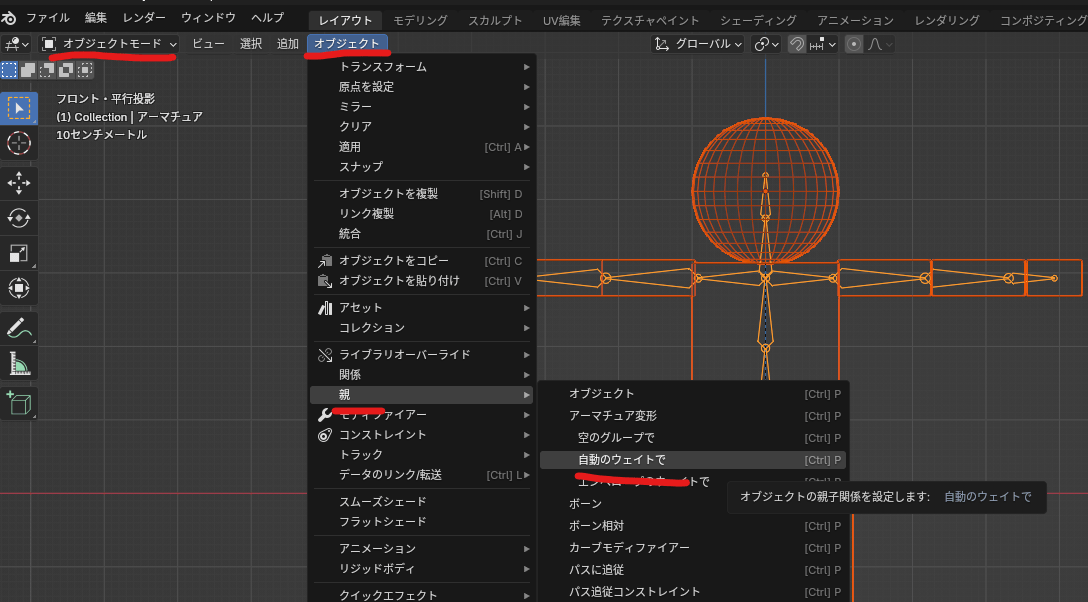アーマチュアをクリックして選択、Shift押しながらメッシュを選択して、 オブジェクト ⇒ 親(ペアレント) ⇒ 自動のウェイトで をクリック