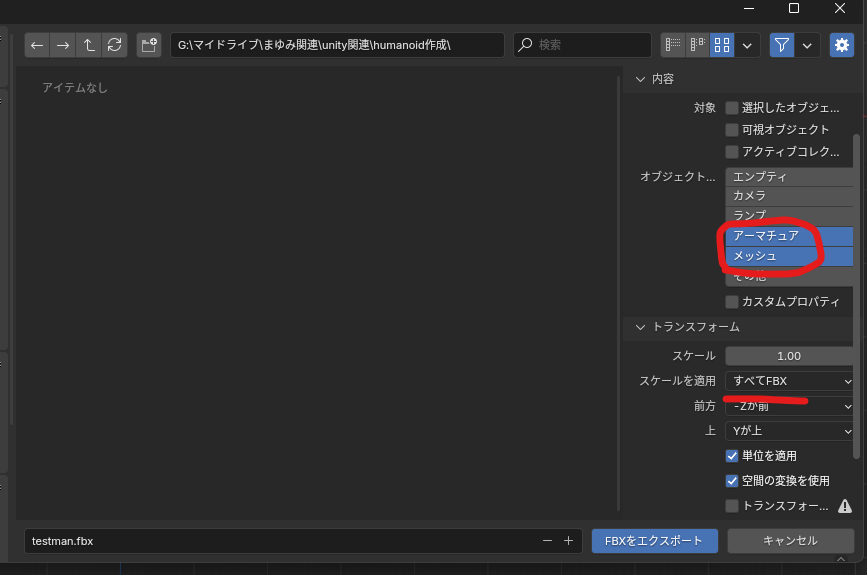 ↓あとは「すべてFBX」を選ばないとunityに持っていった時にトランスフォーム100倍になってしまうのでそこだけ変えておきます。