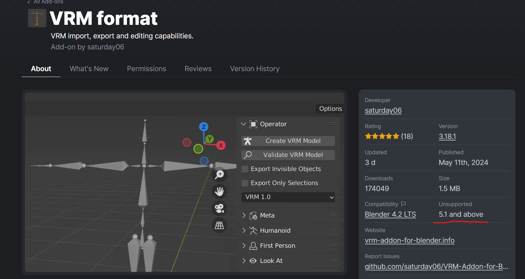 VRM Format(VRM Addon For Blender)、5.1以上はサポート外って書いてあったけどBlender 5.0.1 では普通にインポートして使えました。