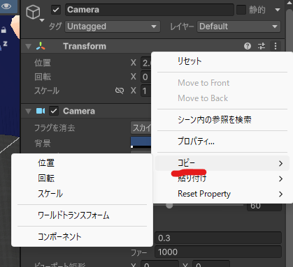 トランスフォームは位置・回転・スケール、もしくはワールドトランスフォームかコンポーネントそのものをコピーするメニューが出ますね。