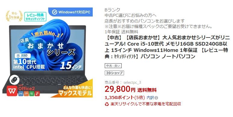 ↓ショップインバースさんは「店長おまかせ」とかいうガチャみたいなパソコンが売っていて、機種は選べないけど第8世代ノートPC(1年保証付)が17800円から買えますw