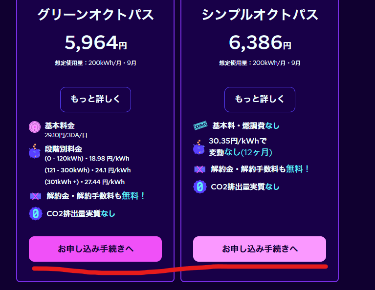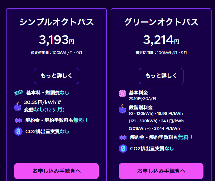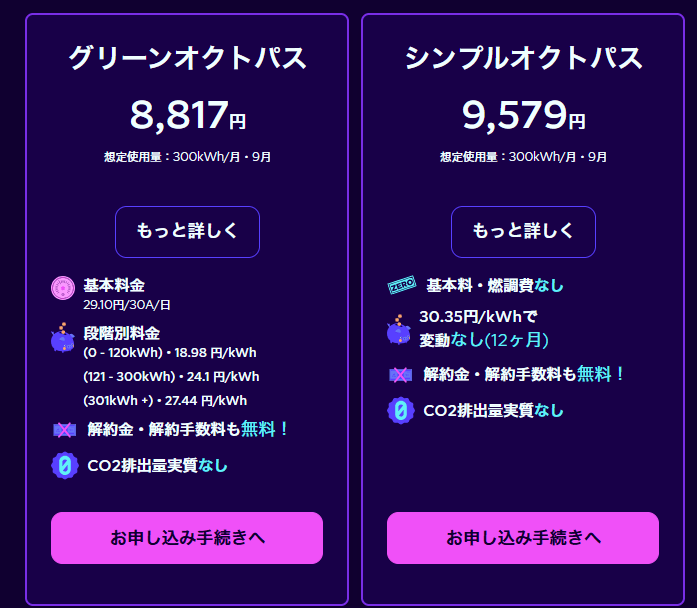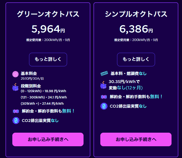 使用量が少ないならシンプルオクトパス、ある程度以上に使うならグリーンオクトパスかな? ※東京電力エリア、30Aの場合