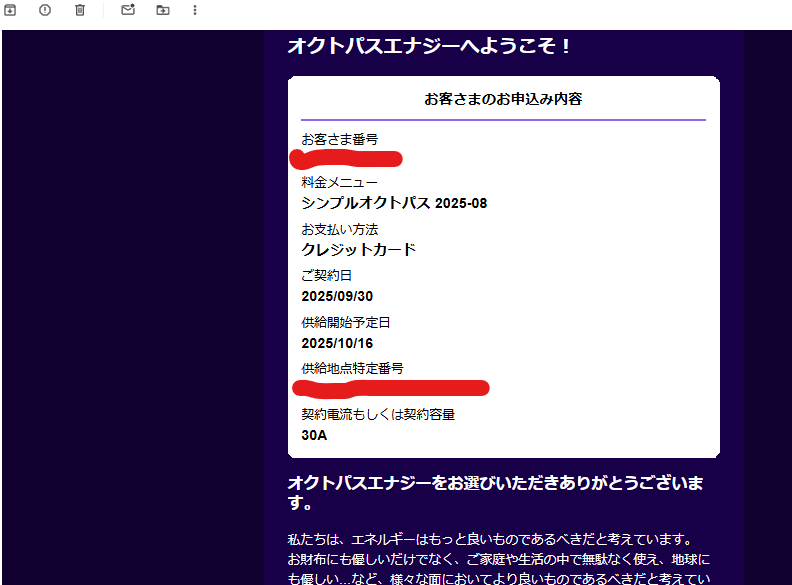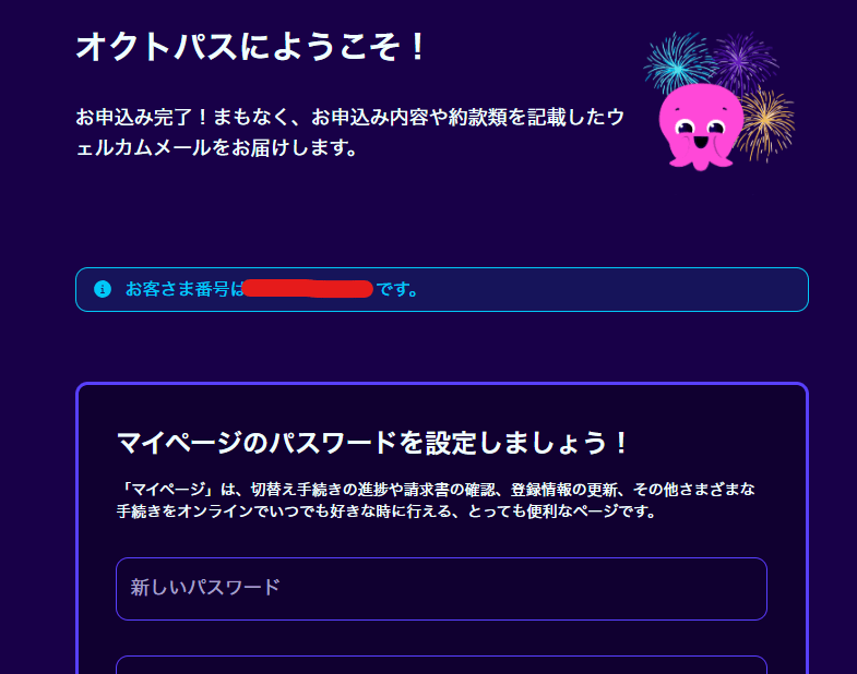 ↓するとこの画面が出てきて番号を確認できるので、お客様番号と供給地点特定番号を申し込み画面に入力すればOK。