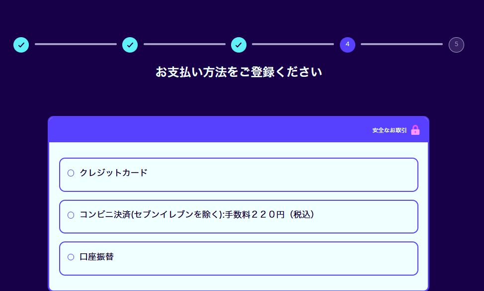 次に支払い方法を登録しますが、コンビニ決済は手数料が220円かかるようです。