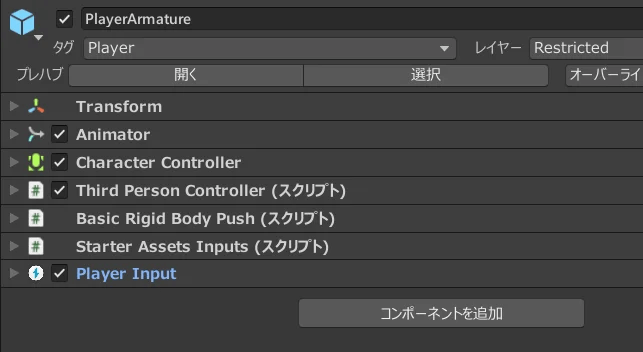 Third Person Controllerを追加したらCharacter ControllerもPlayer Inputも自動で追加されたので、あとはStarter Assets Inputs と Basic Rigid Body Push を追加すればOK。