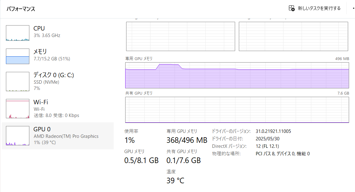 タスクマネージャーでVRAMが見れますが、内蔵グラフィックながら専用VRAMが496MBあるのはうれしいですね。