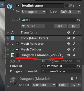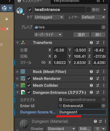 遷移前のシーンに戻り、Dungeon Entranceスクリプトのところの遷移先のシーン名を書き換えます。