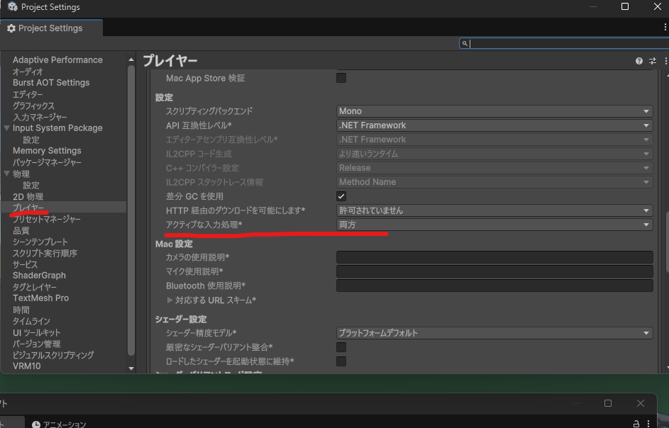 今回のスクリプトは古い入力システムのやつを使ってるみたいなので、ここをBOTH(両方)に変えないと動かなかった。