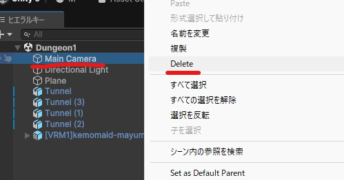 TPSゲームだとたぶんプレイヤー用のカメラがあると思うので、デフォルトで配置されてるメインカメラは削除しておきます。