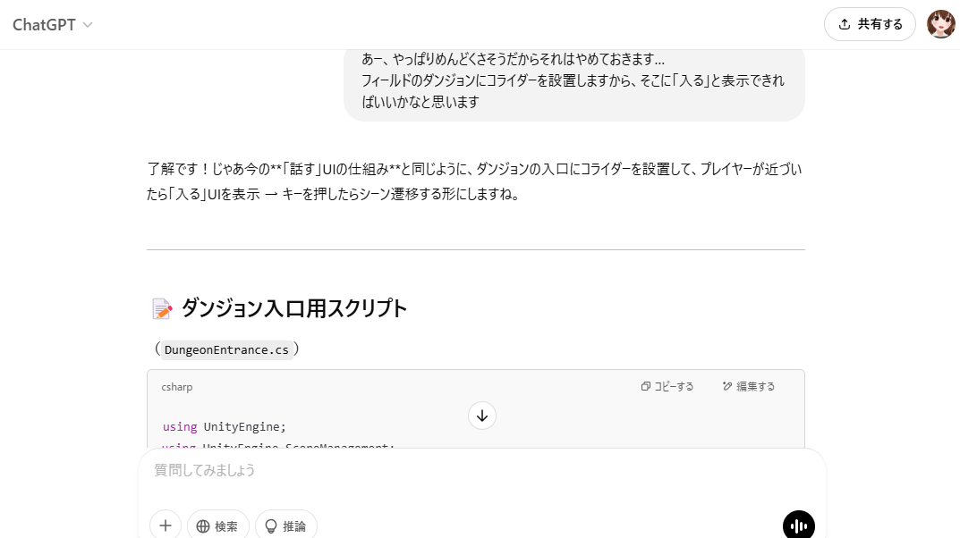 了解です!じゃあ今の「話す」UIの仕組みと同じように、ダンジョンの入口にコライダーを設置して、プレイヤーが近づいたら「入る」UIを表示 → キーを押したらシーン遷移する形にしますね。