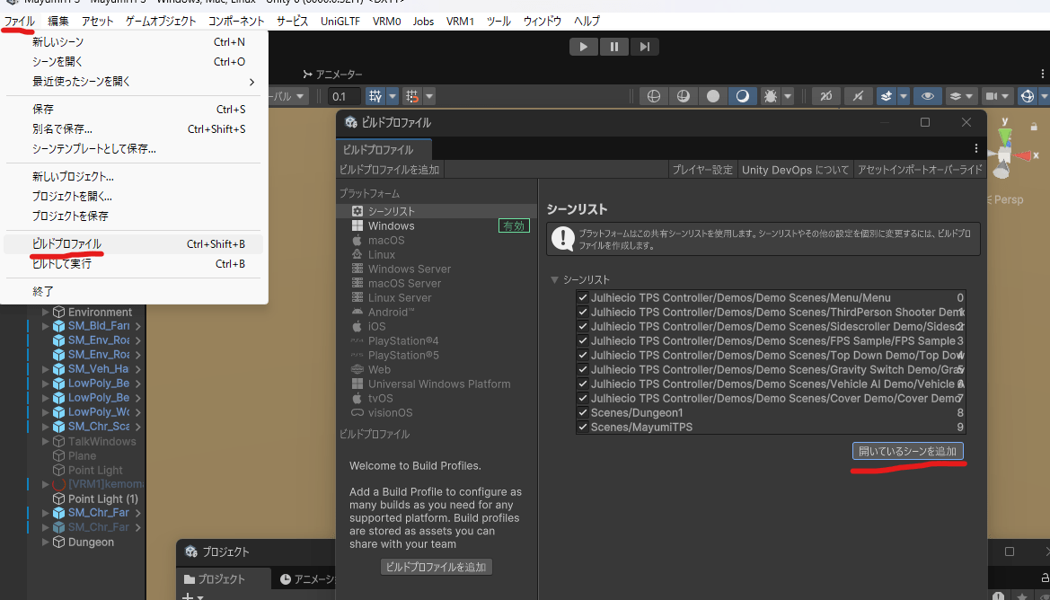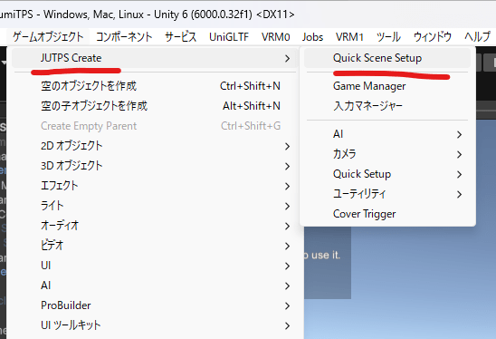 私はJU TPS3アセットを使っているから新しいシーンでQuick Scene Setupをする必要があったけど、これはアセットによります。