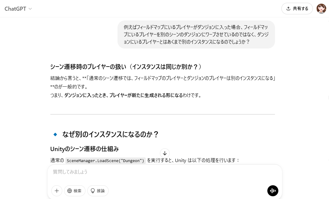 結論から言うと、「通常のシーン遷移では、フィールドマップのプレイヤーとダンジョンのプレイヤーは別のインスタンスになる」のが一般的です。