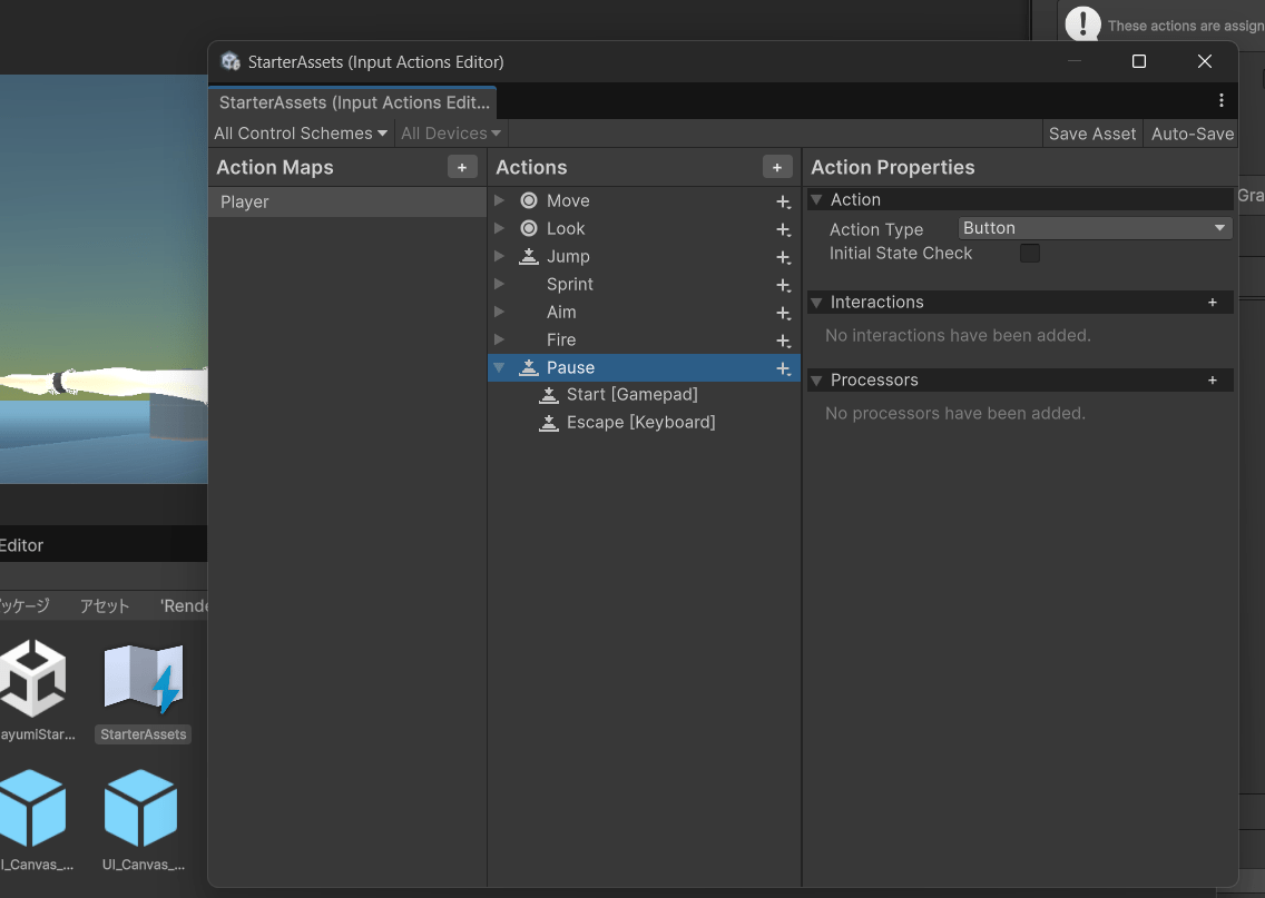Pauseを追加、Start[Gamepad]とEscape[Keyboard]を指定する。