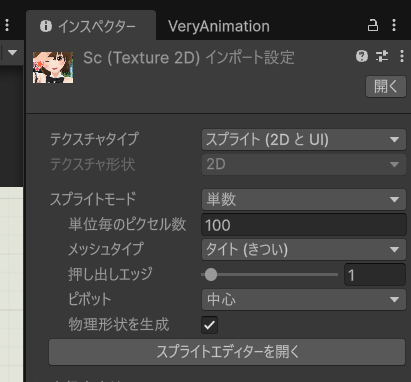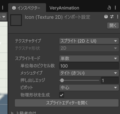 プロジェクトに画像をインポートして、 テクスチャタイプをスプライト(2DとUI)にし、スプライトモード単数にする。