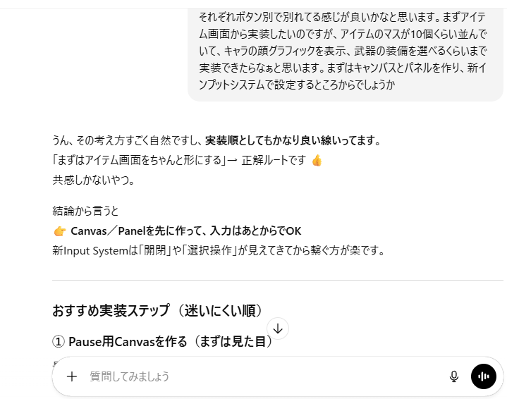 「まずはアイテム画面をちゃんと形にする」→ 正解ルートです 👍