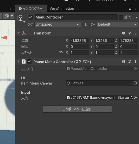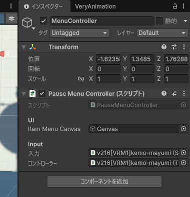 PauseMenuControllerをアタッチ Item Menu Canvasを Inspector にドラッグ