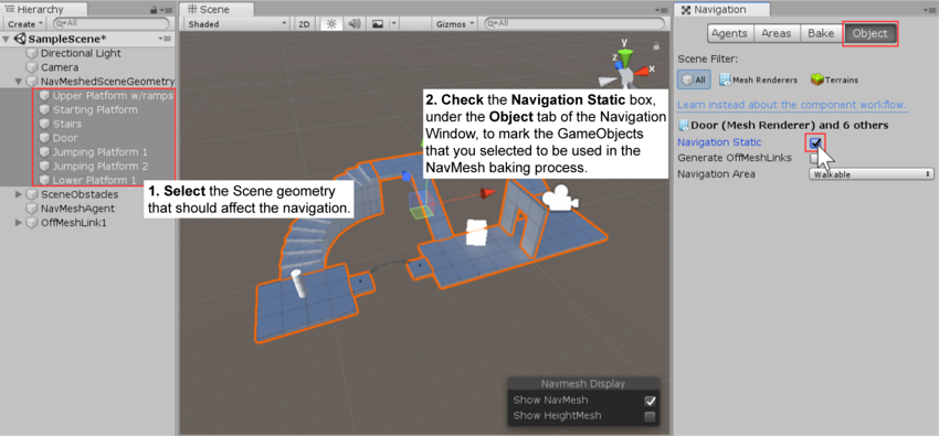 したがって、NavMesh を使用する場合、静的なオブジェクトのコライダーのみが移動可能な領域の計算に使用されます。動的なオブジェクトの移動や相互作用を考慮する場合、それに対するプログラム的な処理が必要になります。