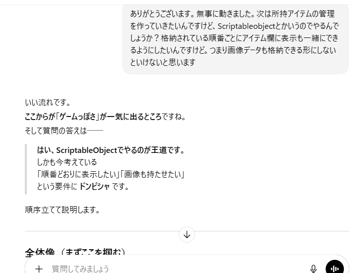 次は所持アイテムの管理を作っていきたいんですけど、Scriptableobjectとかいうのでやるんでしょうか?格納されている順番ごとにアイテム欄に表示も一緒にできるようにしたいんですけど。つまり画像データも格納できる形にしないといけないと思います