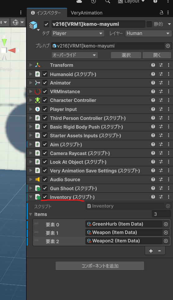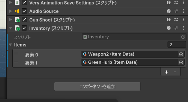 プレイヤーにInventoryコンポーネントを付けて所持品を持たせる