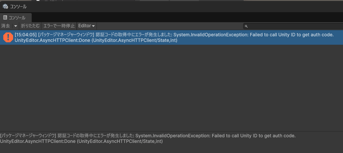[パッケージマネージャーウィンドウ] 認証コードの取得中にエラーが発生しました: System.InvalidOperationException: Failed to call Unity ID to get auth code. UnityEditor.AsyncHTTPClient:Done (UnityEditor.AsyncHTTPClient/State,int) Unity