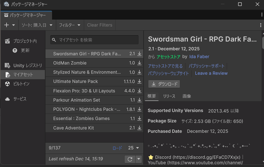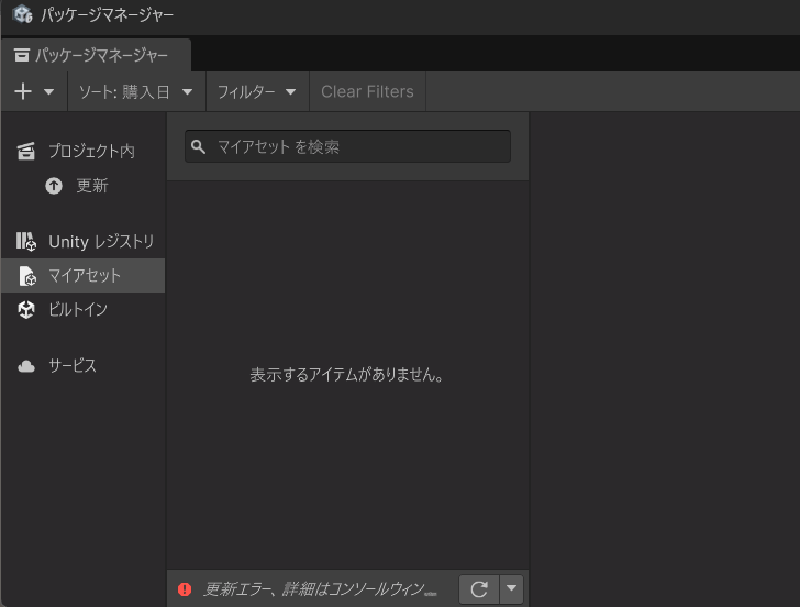 このエラーは Unity ID(ログイン認証)とPackage Managerの通信がうまくいってない ときにかなりよく出ます。My Assets が表示されないのも、その影響です。