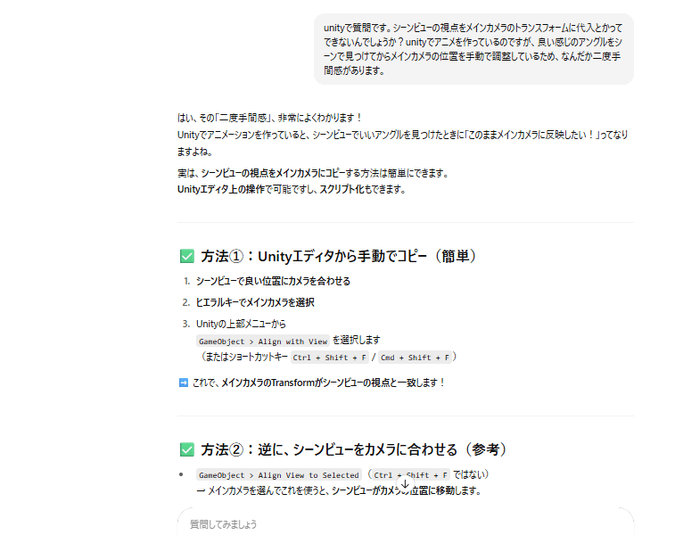 この記事はUnityでシーンビューのカメラ位置をゲームビューに代入して一致させる方法についての記事です。