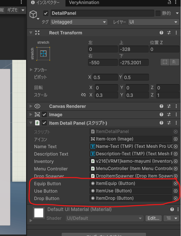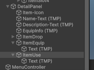 追加した装備ボタンと使うボタンのクリック時にItemDetailPanelのスクリプトを指定します。