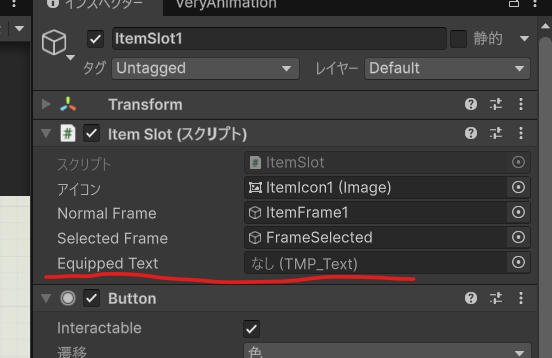 そのため装備ボタンと使うボタンは同じ位置に配置しておく。とりあえず動作確認のために少しずらしておくけど。
