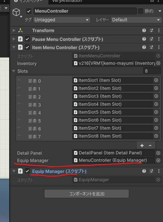 MenuControllerにEquipManagerをアタッチし、ItemMenuControllerのEquipManagerに指定します。