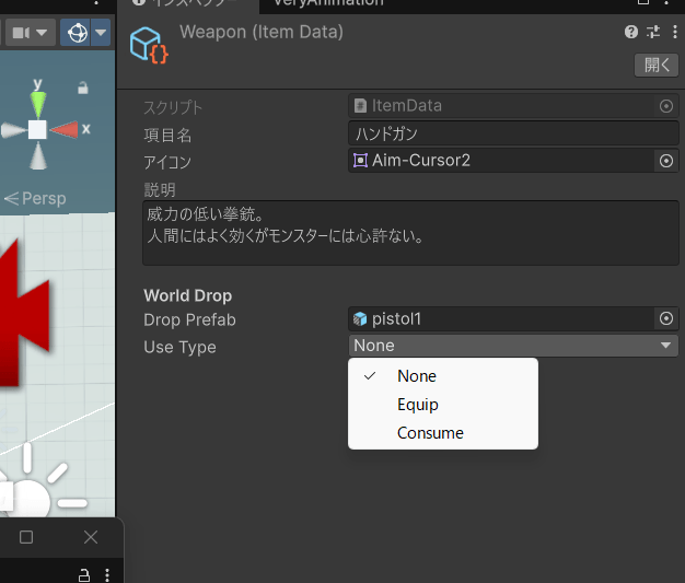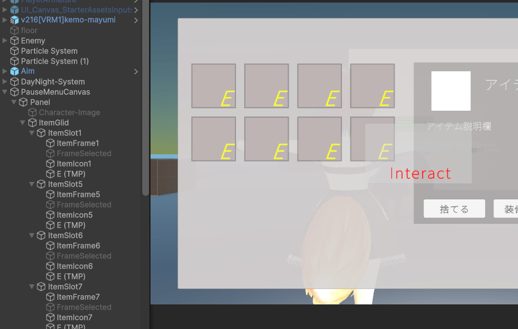 じゃあまずアイテムメニュー欄に装備スロットを用意して、デフォルトで銃を装備している設定を実装したほうがいいですかね。まだアイテムを捨てる設定しか作っていないため、装備ボタンすらないのです