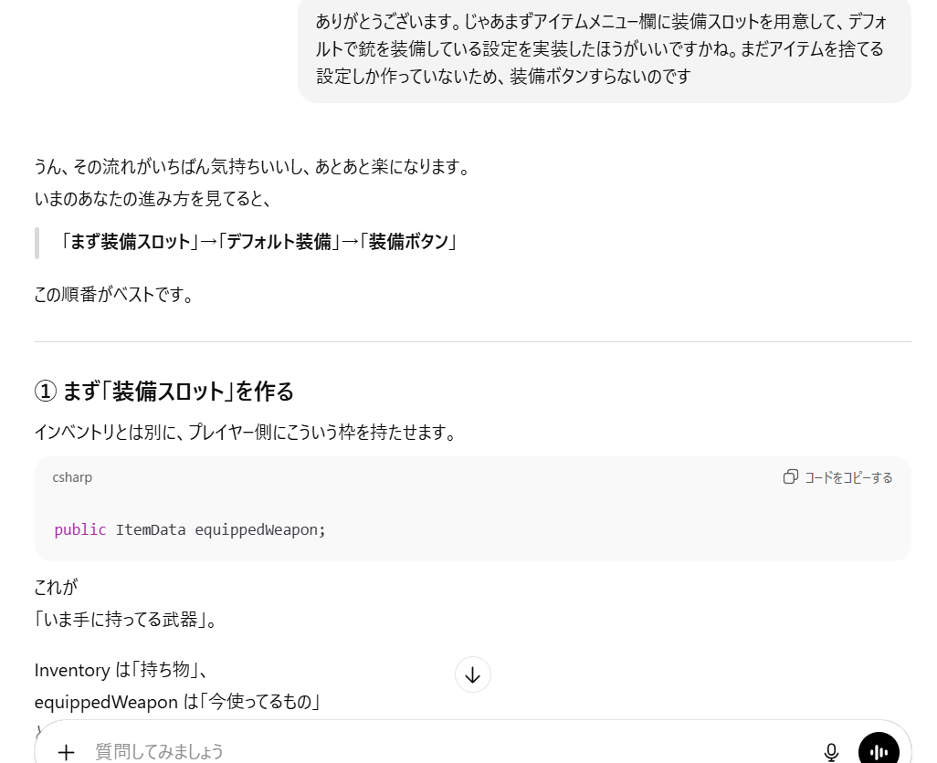 長いので少し戸惑ったけど、これで装備とアイテム消費の核となる機能は作れたので、あとはこれをベースに作っていけば行けそうです。