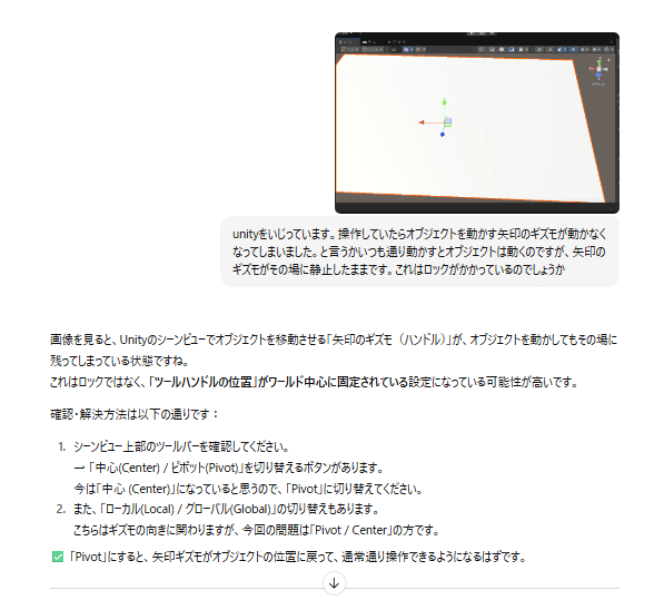 ✅ 「Pivot」にすると、矢印ギズモがオブジェクトの位置に戻って、通常通り操作できるようになるはずです。