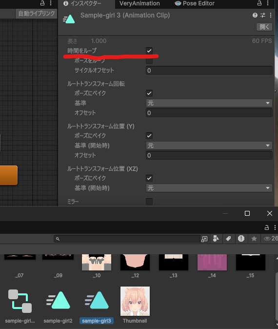 「時間をループ」などアニメーションクリップの設定 ※重要