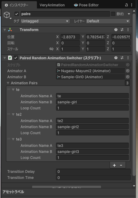 2人のモデルのアニメーターを指定し、アニメーションのペアを手動で入れる。何回ループするかや遷移間隔なども指定できます。
