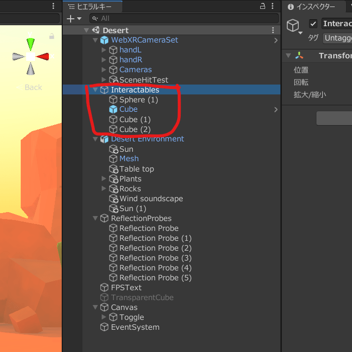 WebXRCameraSetはVR機器のカメラと手、他のオブジェクトはFPSを表示するやつとか砂漠の背景とかみたい。