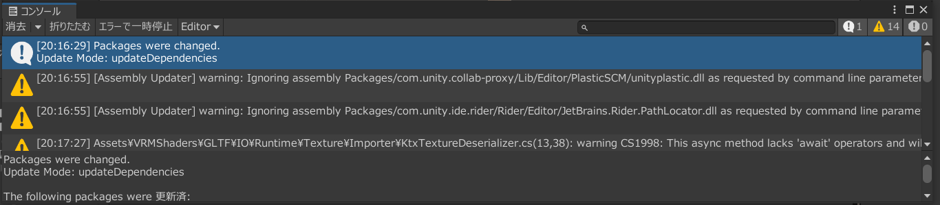 続行すると、一部のパッケージが更新される場合があります。プロジェクトのパッケージに加えられた変更の一覧は、プロジェクトフォルダーのLogs/Packages-Upgrade.logファイルを参照してください。