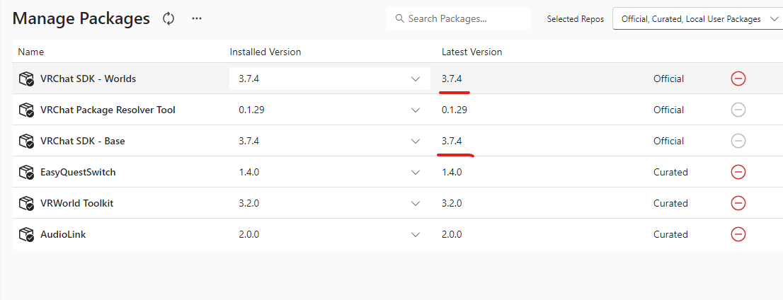 アップデートがあるとVRChat SDK Worlds(ワールドプロジェクトの場合)とVRChat SDK Baseのところが緑色になってるからクリックすればOK。