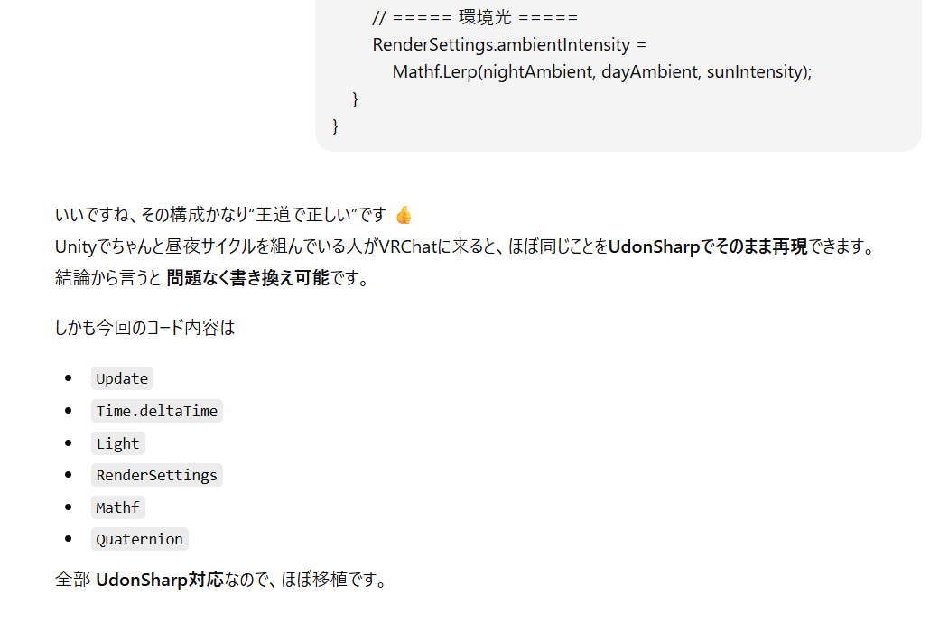 VRChatでワールド作成をしています。ディレクショナルライトを太陽にして24時間の昼夜システムを作りたいです。 Unityでゲーム制作もしているのでそこで実装したスクリプトがあるのですが、これをUdonに書き換えて実装できないでしょうか?