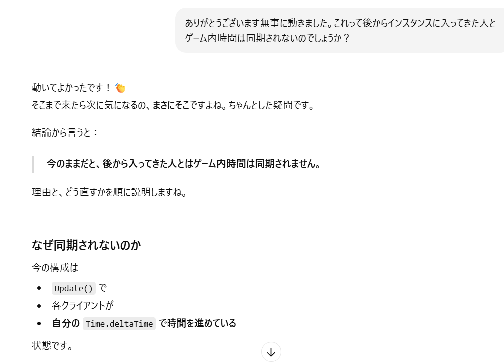 このままだと後からインスタンスに入ってきた人と時間の同期ができないため、ちょっと書き換える必要があるっぽい。