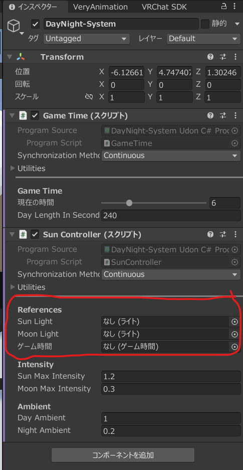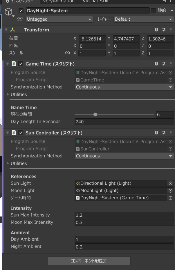新たに作るのはMoonLightだけで、SunLightとゲーム時間のところは既にあるディレクショナルライトとUdonコンポーネントを指定するだけ。