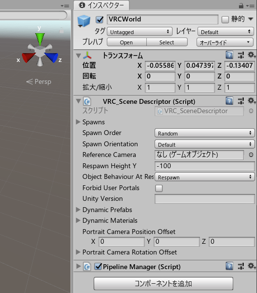これはVRCWorldのインスペクターメニューの、VRC_SceneDescriptorコンポーネントをいじる感じっぽい。