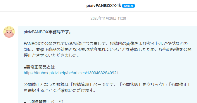 別のR18画像をFANBOXに上げたところ、メッセージが来て強制非公開にされましたΣ(゚Д゚)