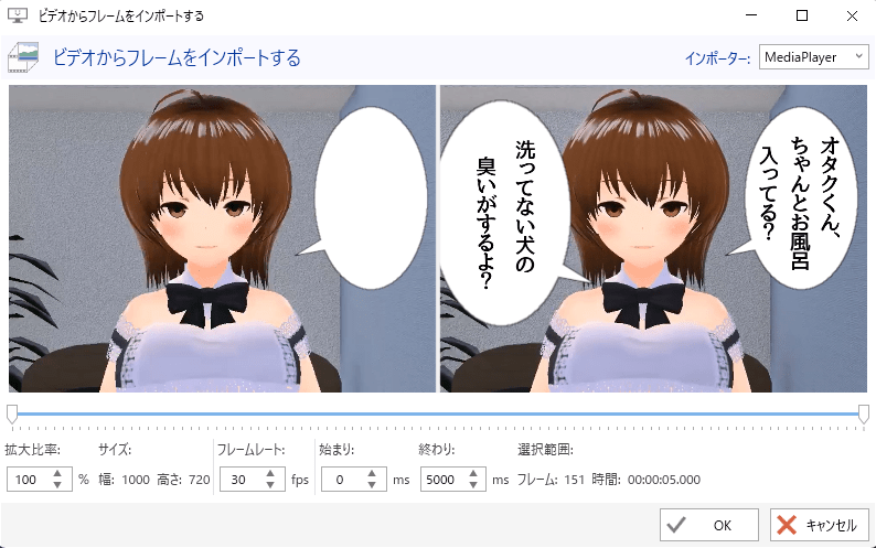 拡大比率やフレームの設定が出るけど、特にいじらずインポートする。